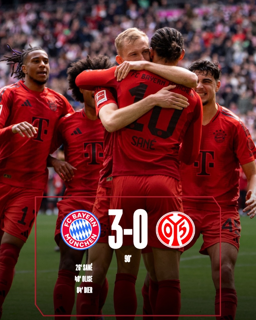 Ở loạt trận vòng 31 Bundesliga, Bayern Munich đã dễ dàng đánh bại Mainz 3-0 nhờ các bàn thắng của Leroy Sane, Michael Olise và Eric Dier. Tuy nhiên, chiến thắng này chưa đủ để Bayern sớm giành chức vô địch do ở trận cùng giờ, Leverkusen đã vượt qua Augsburg với tỉ số 2-0.